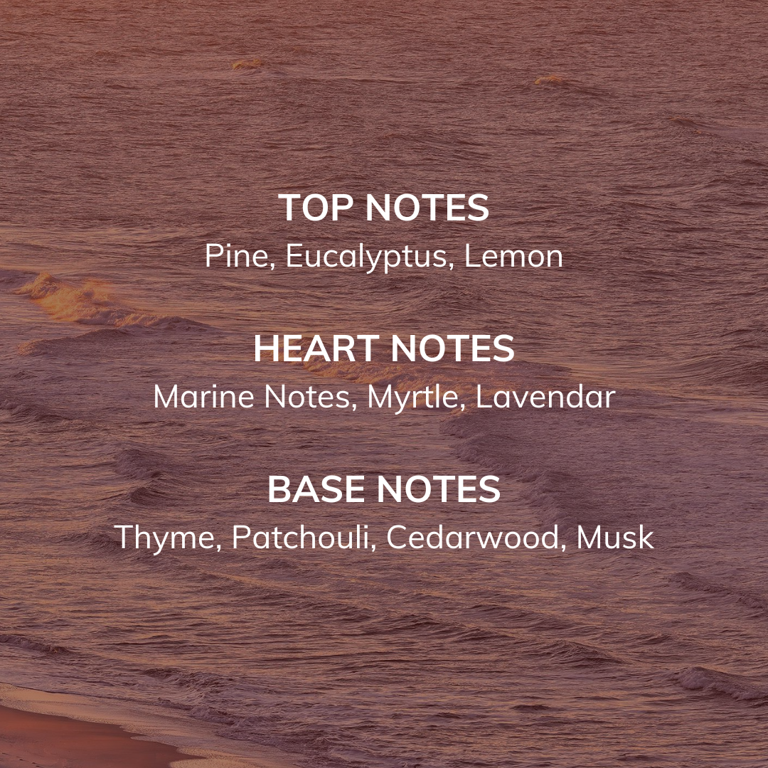 Opening with pine, eucalyptus, and lemon, the fragrance unfolds into a heart of marine notes, myrtle, and lavender — evoking salty air, soft winds, and endless blue horizons. The base settles into thyme, patchouli, cedarwood, and musk, leaving a refined and long-lasting trail.
